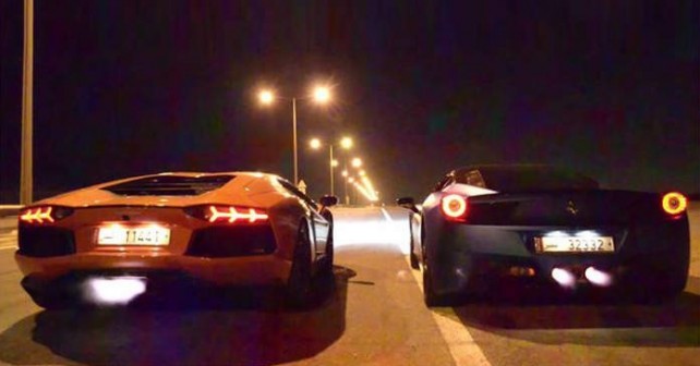 Οι κουρασμένοι σεΐχηδες, μετά από μία δύσκολη μέρα κάνοντας ψώνια και ναργιλέδες στα Μall, είπαν να το ρίξουν έξω. Με τον κλασικό αραβικό τρόπο: βάζεις δίπλα δίπλα μία Ferrari 458 και μία Lamborghini Aventador και κάνεις σα πεντάχρονο «βρουμ, βρουμ» για να βγάζουν φωτιές από την εξάτμιση.|